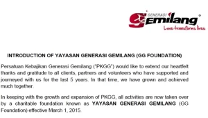 In December 2014, Yayasan Generasi Gemilang was incorporated as a charitable foundation.